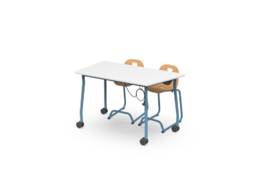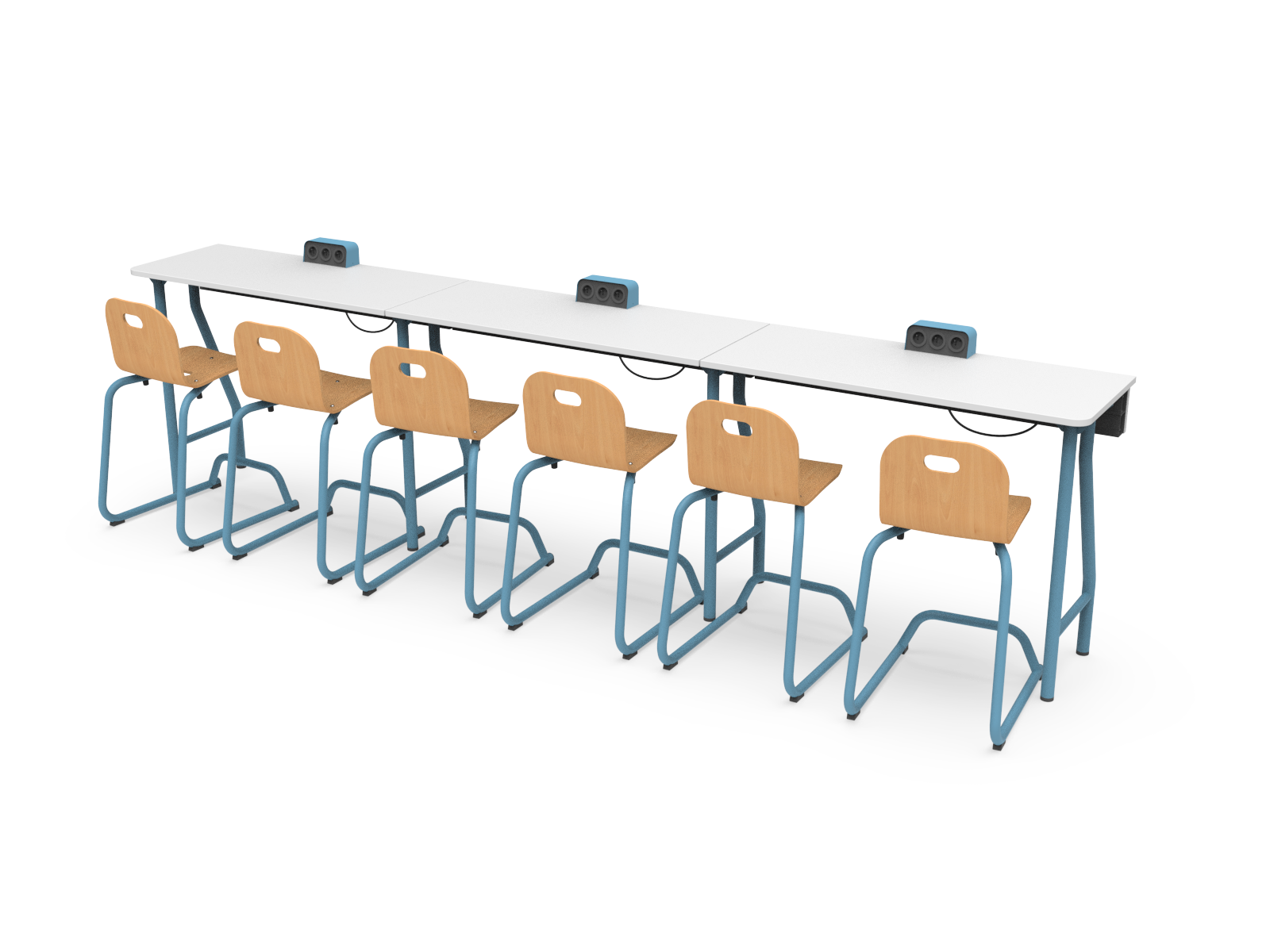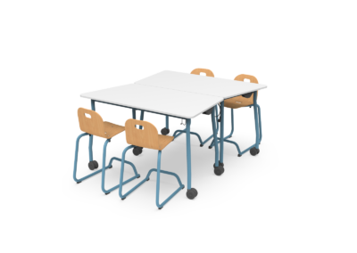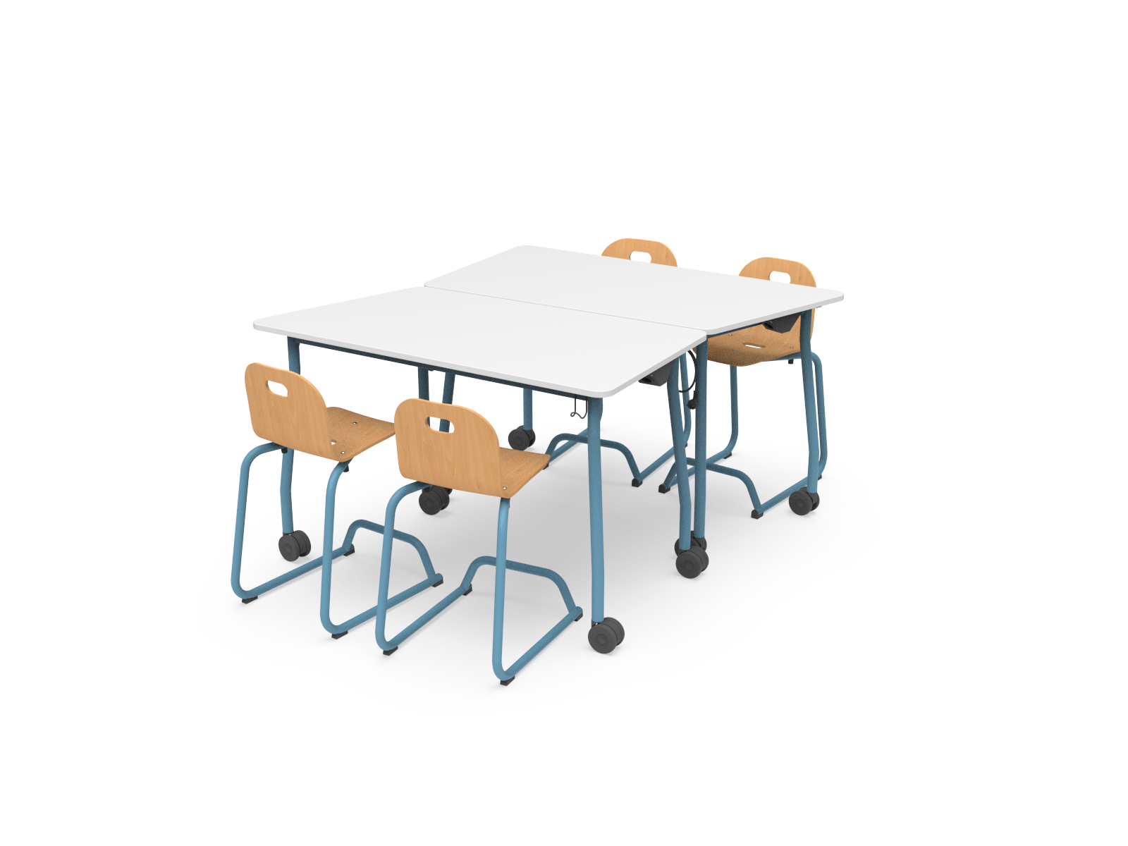 Des crochets sous les plateaux permettent de les assembler en îlot ou en linéaire : Lorsqu’ils sont en rang dans la classe, les élèves sont légèrement en épis par rapport au tableau et au professeur. Cet agencement permet de garder le contact visuel même en présence d’écrans. Des îlots de 2, 4, 6 voire 12 personnes sont réalisables pour des travaux de groupe ou pour une démonstration collective. Chaque table est bien évidemment utilisable individuellement, notamment lors des examens.