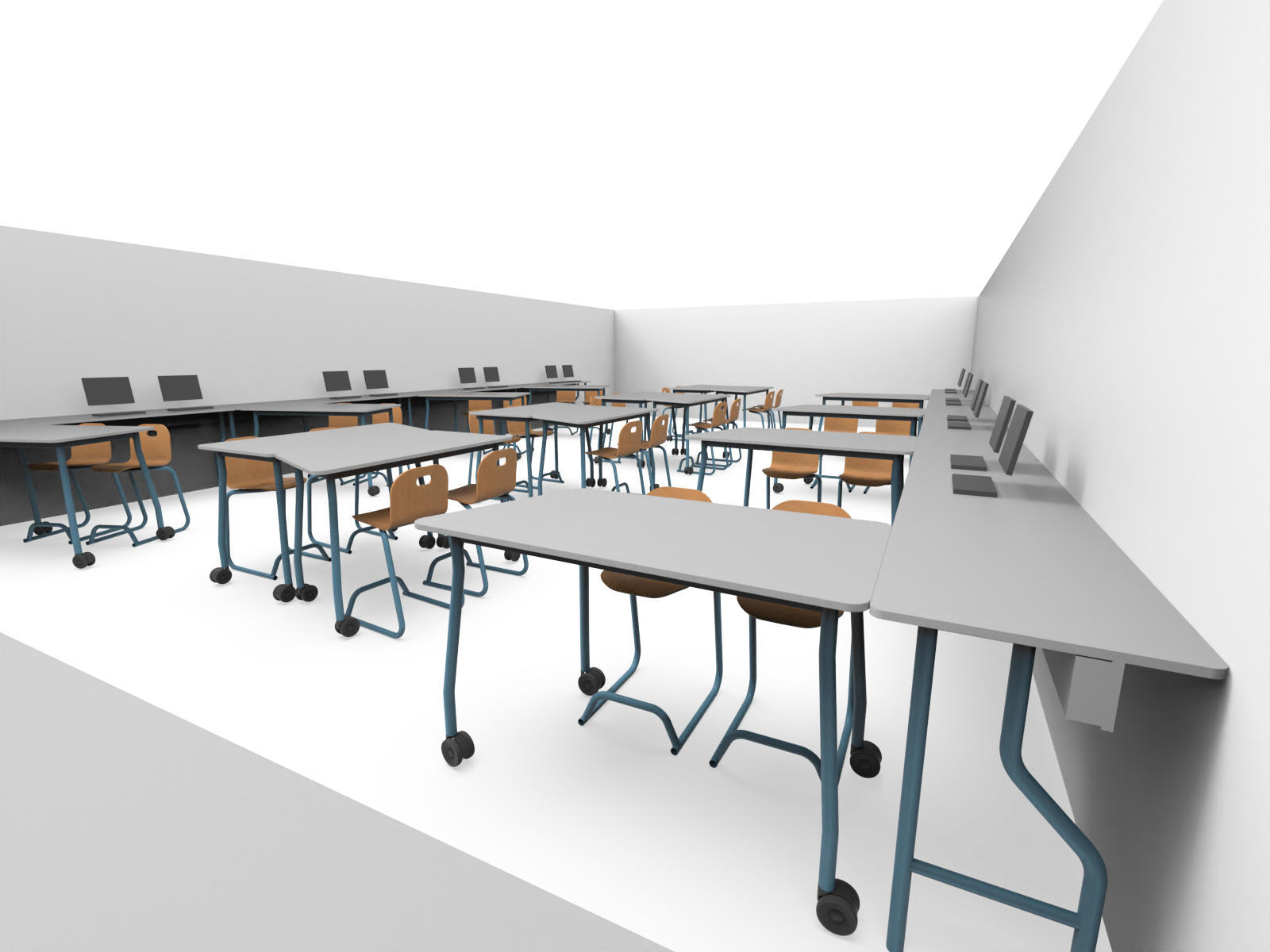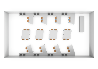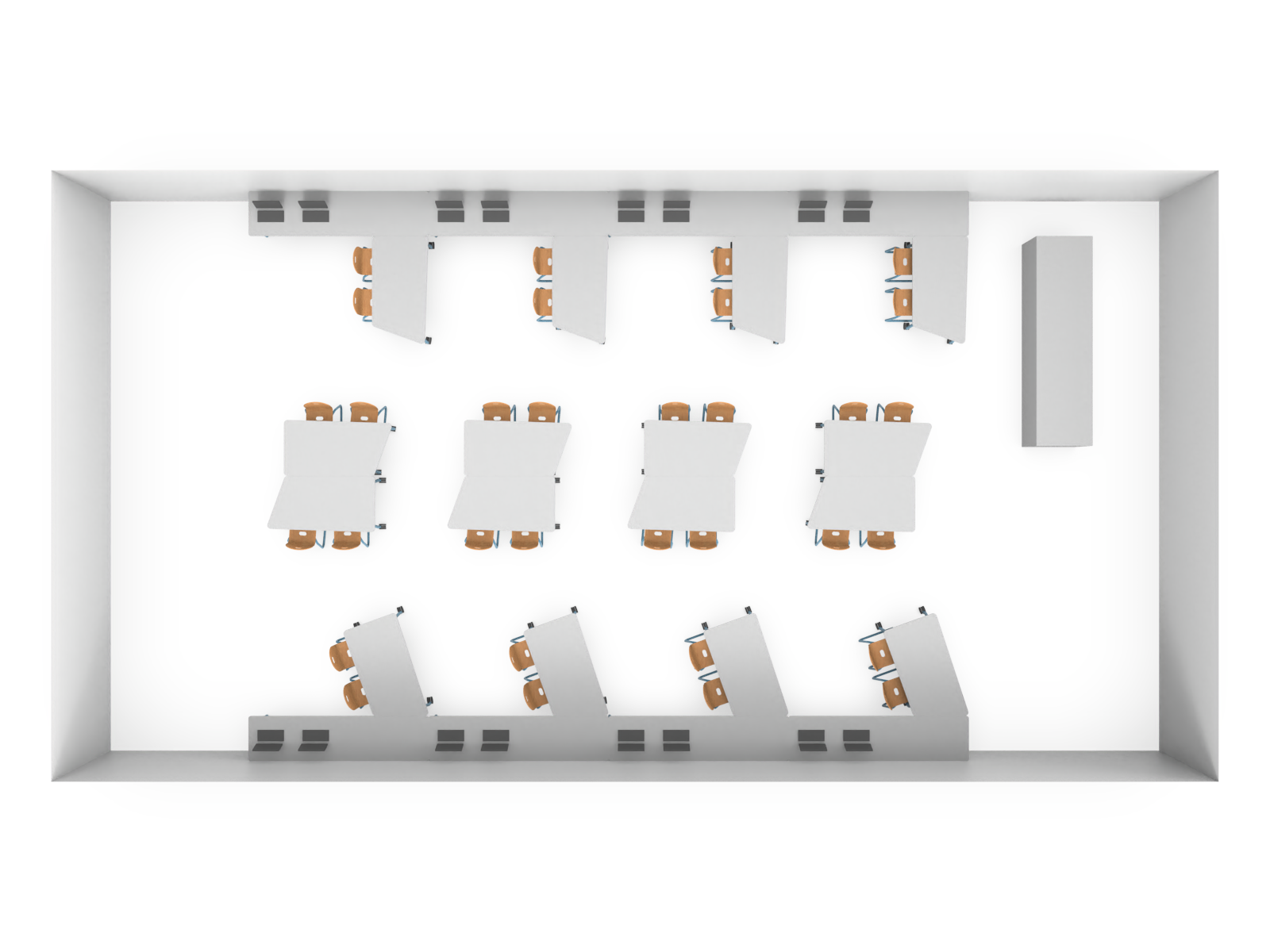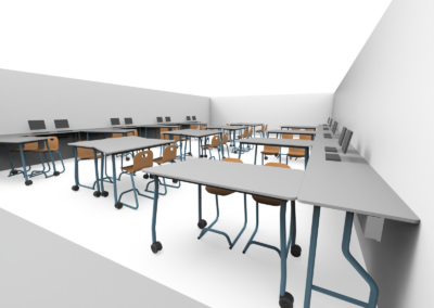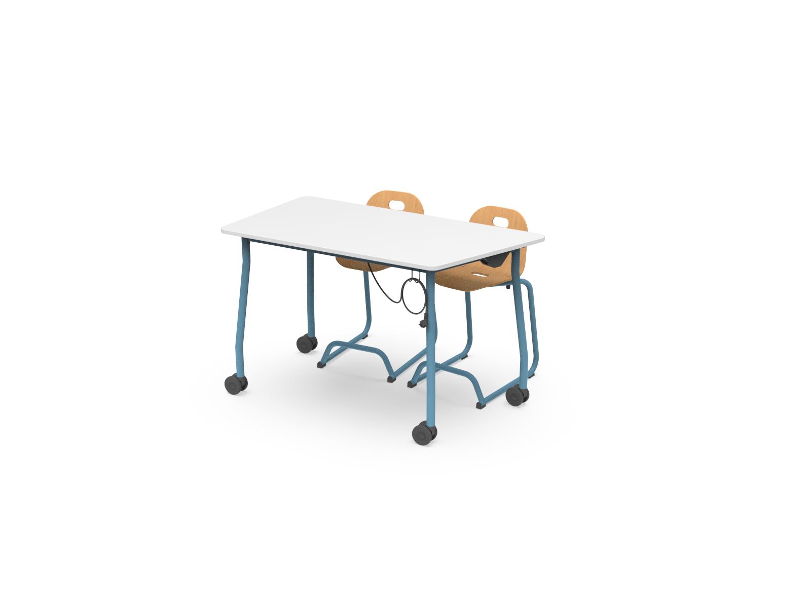 Des crochets sous les plateaux permettent de les assembler en îlot ou en linéaire : Lorsqu’ils sont en rang dans la classe, les élèves sont légèrement en épis par rapport au tableau et au professeur. Cet agencement permet de garder le contact visuel même en présence d’écrans. Des îlots de 2, 4, 6 voire 12 personnes sont réalisables pour des travaux de groupe ou pour une démonstration collective. Chaque table est bien évidemment utilisable individuellement, notamment lors des examens.