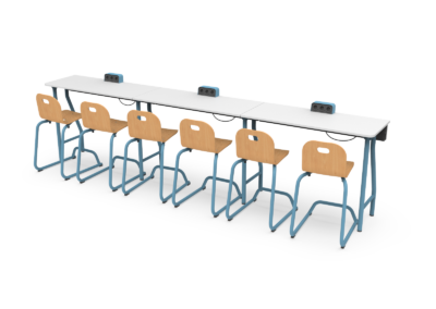 Les tables filantes proposent également des blocs prises sur le plateau. Ils sont facilement accessibles aux élèves et extrêmement robuste. Précâblés, ils sont installés facilement au moment de la pose. Ils proposent au choix des prises électriques standards 16A et des prises USB A et C, ou RJ45.
